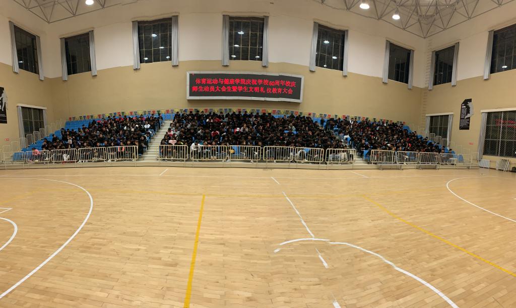 10月8日晚上7:30,金年会jinnianhuicom在综合体育馆组织召开庆祝学校60周年校庆师生动员大会暨学生文明礼仪教育大会。体育学院领导班子成员、全体教职工及17级、18级、19级全体学生,共计600多人参加。会议由学院党总支副书记吴建全主持。